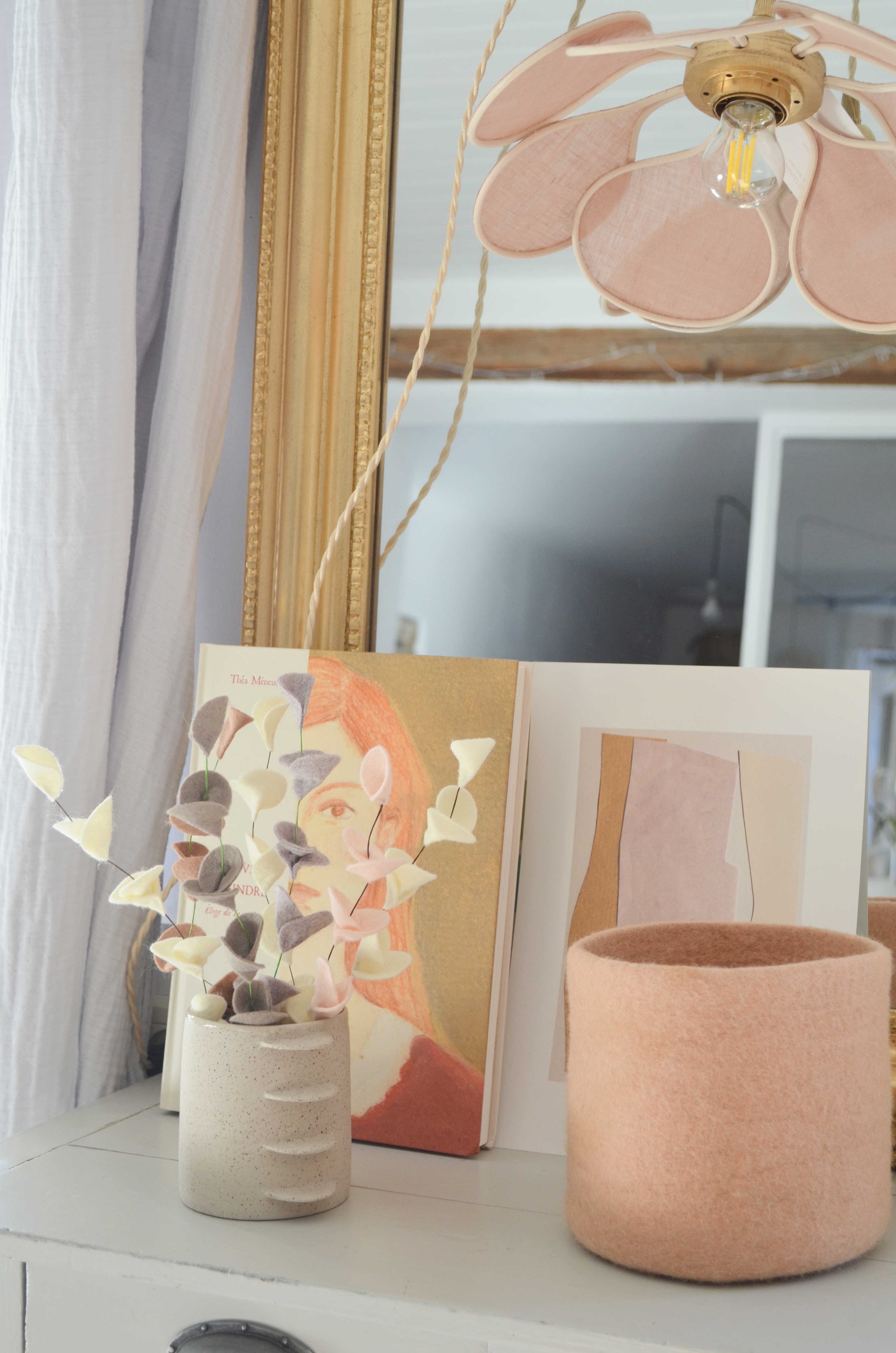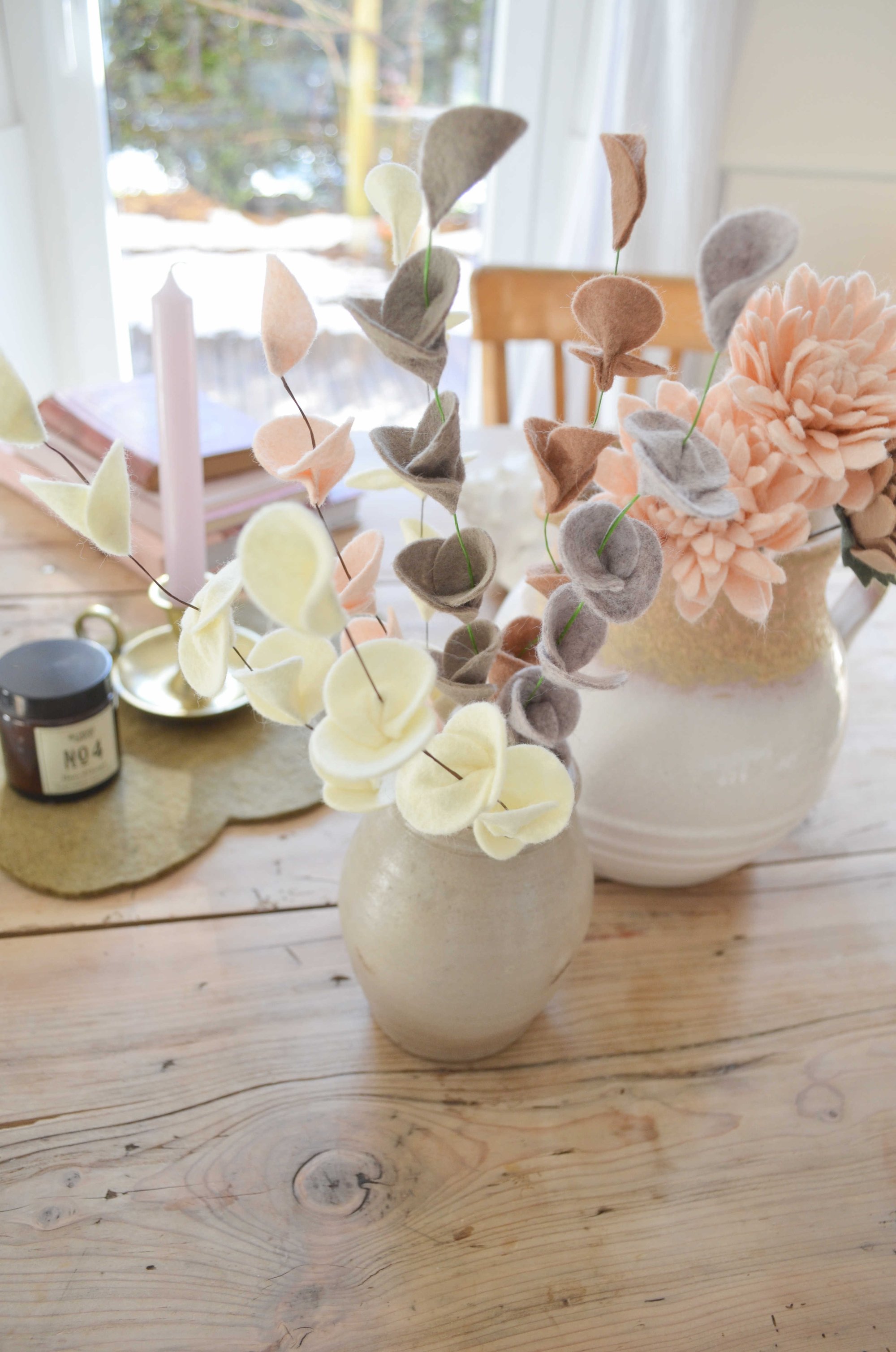 Bouquet de 7 branches porte-bonheur en laine feutrée tons neutres,