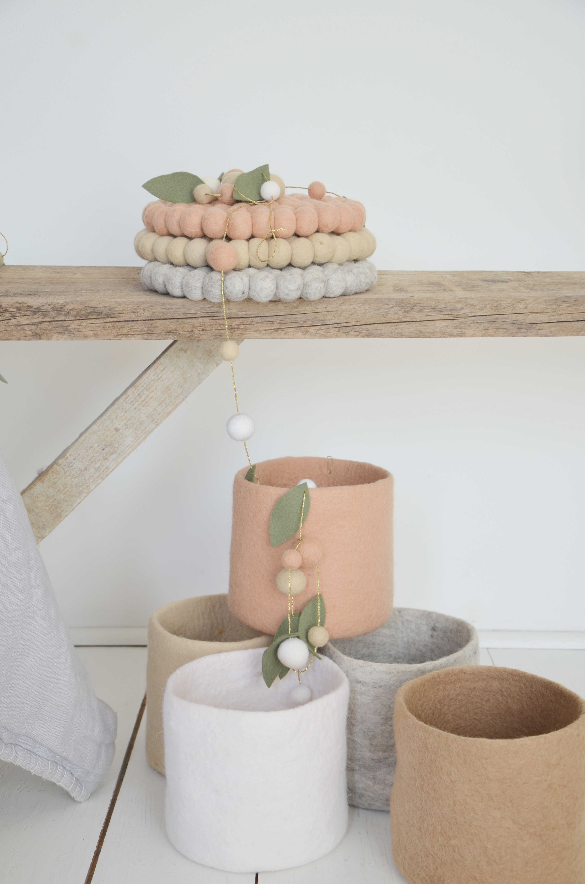 Dessous de plat en boules de feutre tonalité pêche, beige et jute