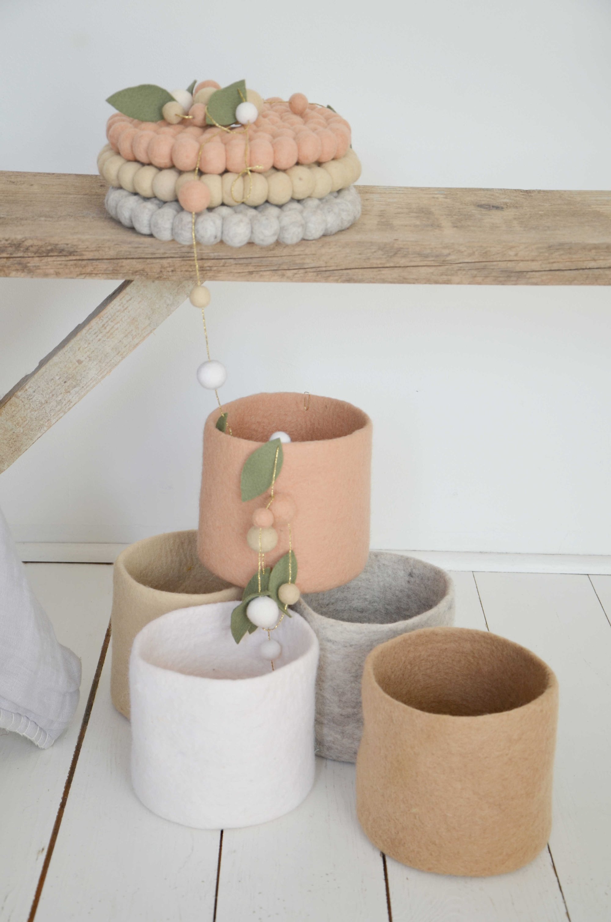Joli set de boules de laine feutrée de 20 cm de diamètre. Chaque boule de feutre mesure 2 cm. Le set peut servir à décorer une étagère ou mettre en valeur un objet comme un vase, un pot de fleur, une statuette, des livres....il peut aussi simplement servir de dessous de plat sur une jolie table.
