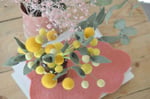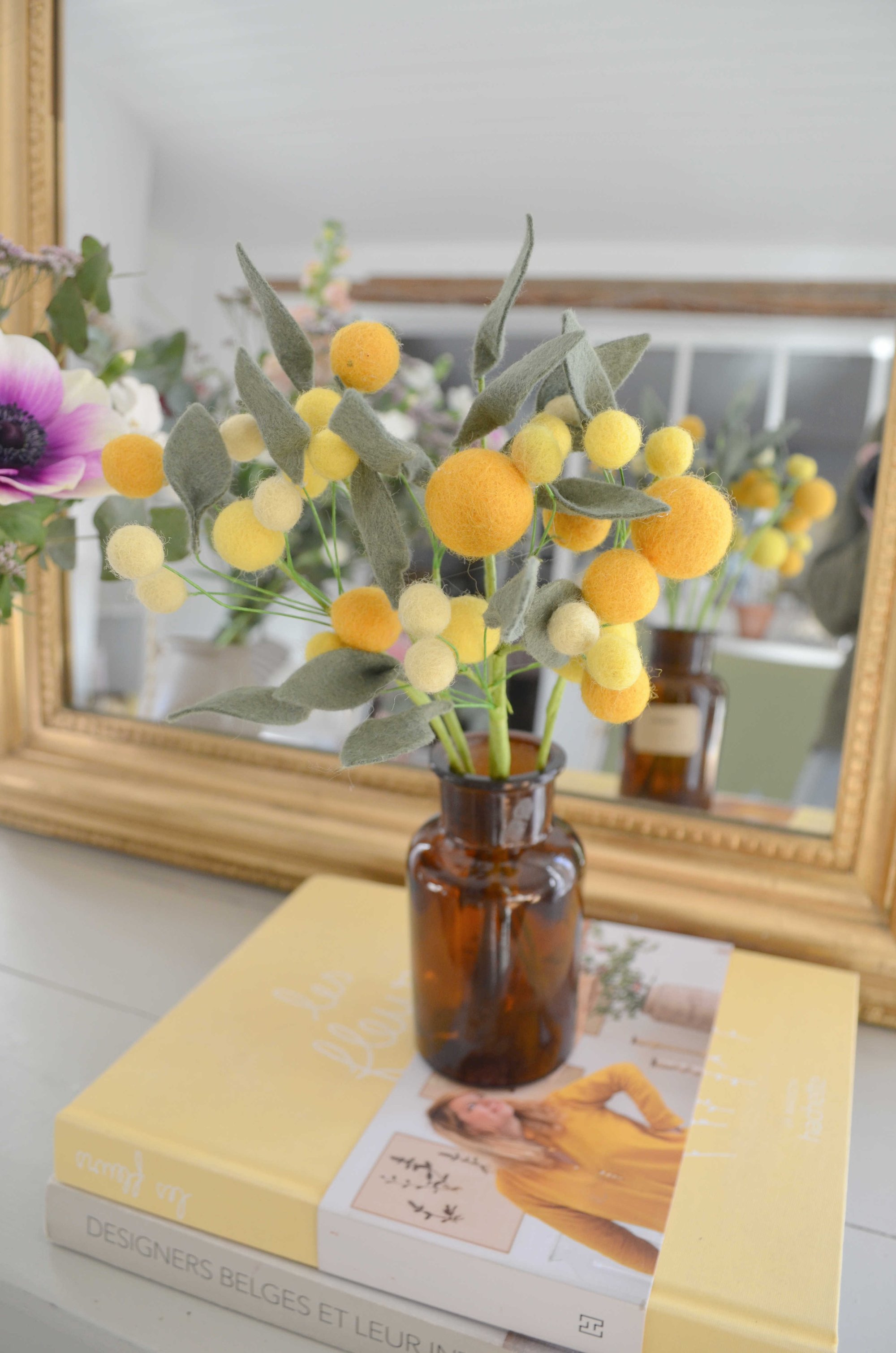 le bouquet est composé de branches de boules de différentes tonalités de jaunes et de différents diamètres.