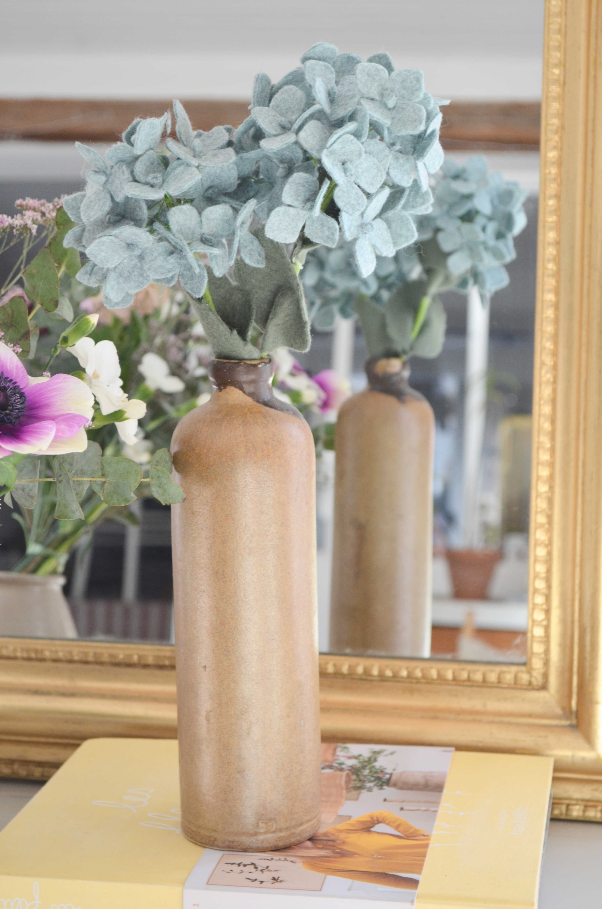 Bel hortensia bleu ciel décoratif en laine feutrée de 33 cm de hauteur, durable et intemporel.