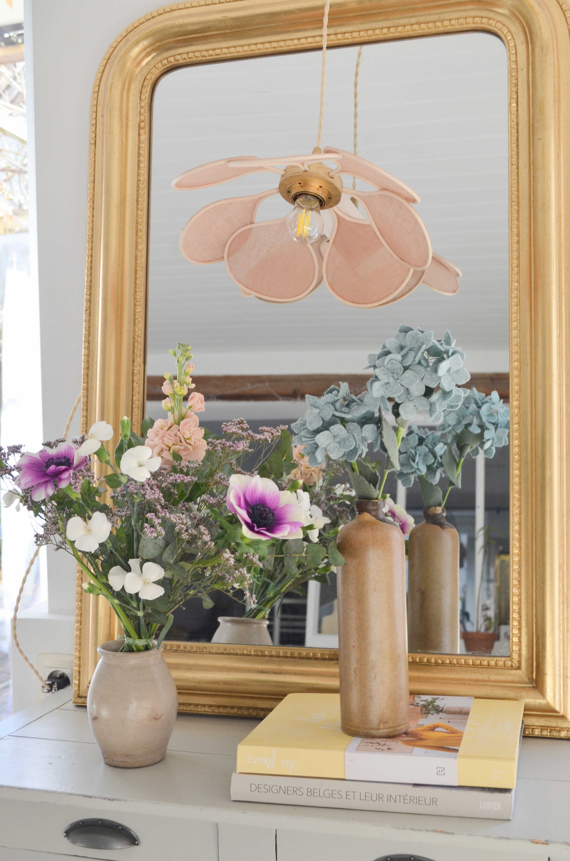 La fleur est en feutrine de laine mérinos et la tige en métal recouverte de papier.