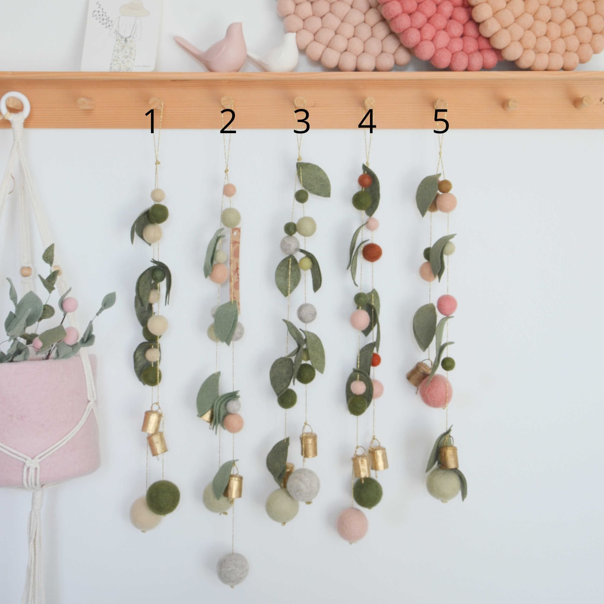 Suspension porte-bonheur en laine et laiton martelé, composée de feuilles en laine mérinos découpées à la main et de boules en laine feutrée !